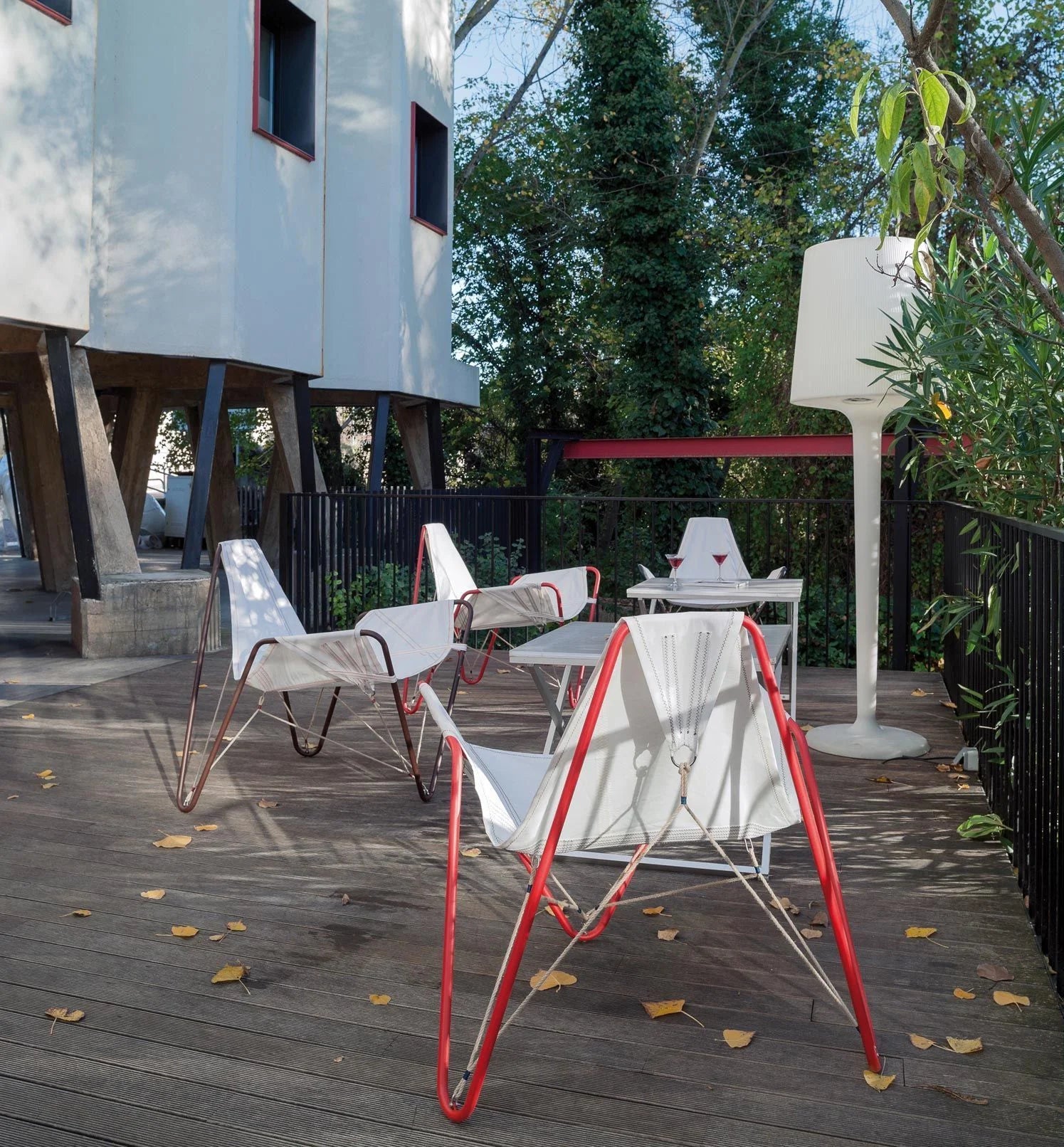 Partiendo de una estructura de tubo de acero con una silueta de tres pies y tres soportes, "recortamos" la tela y la estructura utilizando únicamente una cuerda tensada para obtener un sillón ligero y evocador.