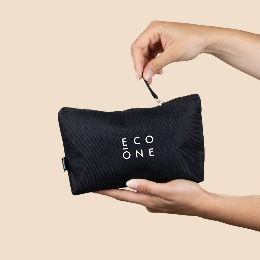 Neceser CINTIA ecológico en resistente material 600D RPET. Disponible en negro o beige, personalizable a 1 color o a todo color. Práctico, elegante y sostenible.