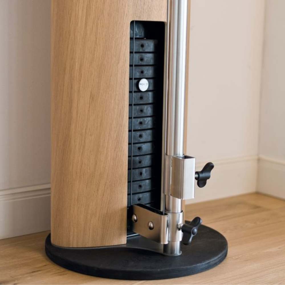 NOHRD SlimBeam para hoteles con una estructura compacta de tan solo 215 cm de alto, 40 cm de ancho y una base de menos de 0,25 m², se adapta a cualquier espacio sin comprometer funcionalidad. El sistema incluye una pila de 15 placas de peso (14 x 5 kg + base de 5 kg), recubiertas de goma para mayor durabilidad y un entrenamiento silencioso. Además, su función mariposa giratoria permite entrenar de forma unilateral o bilateral, ajustándose a cualquier altura.