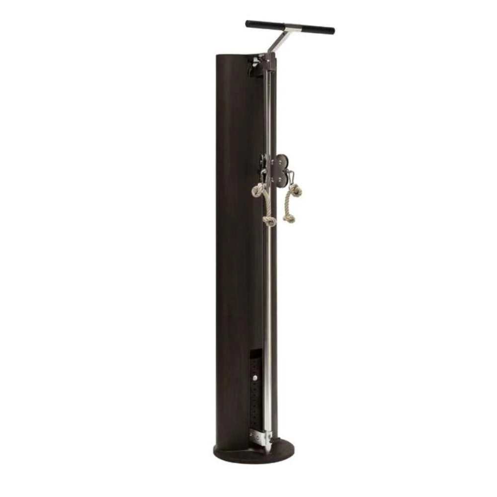 Estación de poleas multifuncional con diseño elegante en madera maciza, 75 kg en placas de peso, poleas ajustables y función mariposa. Ideal para entrenamiento funcional profesional o doméstico.