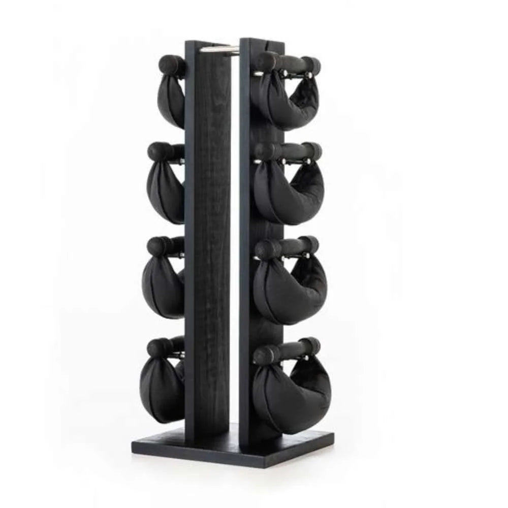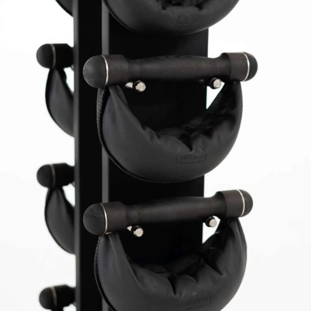 Cada NOHRD SwingTower para hoteles incluye cuatro pares de pesas SwingWeights de 2, 4, 6 y 8 kg. Estas pesas únicas están formadas por un mango de madera ergonómico unido a una funda de cuero auténtico cosida a mano. En su interior, pequeños gránulos de hierro se mueven libremente, creando un desequilibrio dinámico que estimula músculos estabilizadores, articulaciones y tejido conectivo de forma más efectiva que las pesas convencionales.