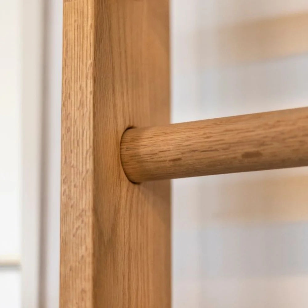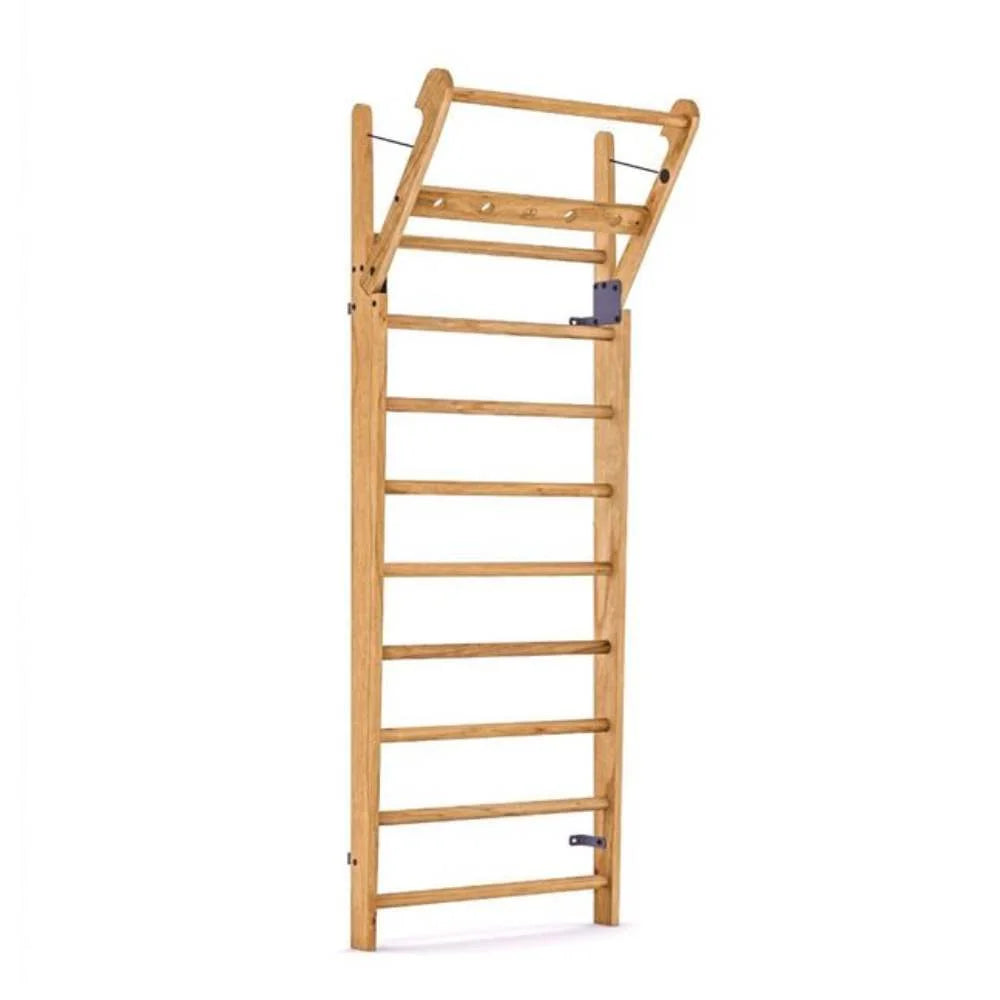 Barras de pared de madera con barra plegable para dominadas. Ocupan solo 13 cm de fondo. Disponibles en 10 o 14 peldaños. Con accesorios opcionales para entrenamiento funcional completo.