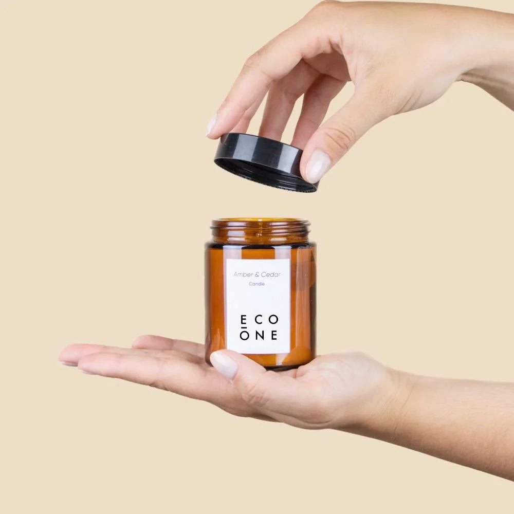 Vela CANDI de cera vegetal de soja con fragancia de Ámbar y Cedro. Presentada en frasco de vidrio y personalizable a todo color. Elegancia aromática y compromiso sostenible para hoteles.