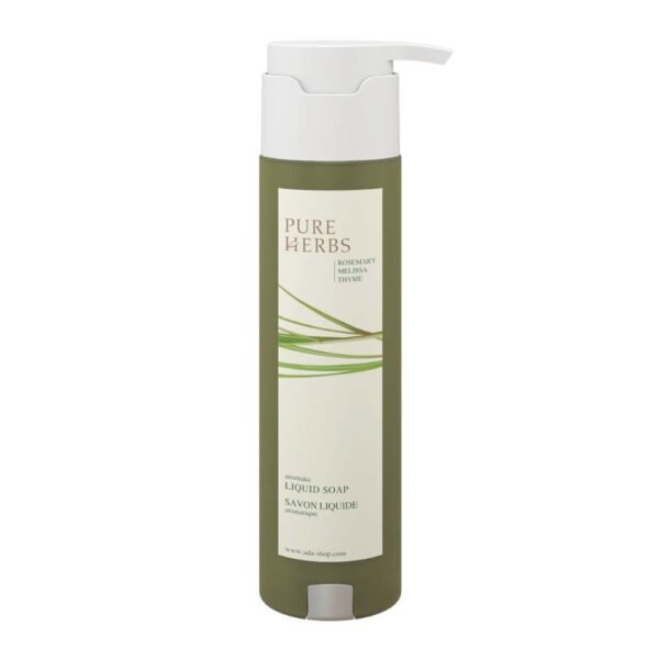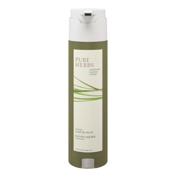 Jabón líquido 300ml para hoteles Pure Herbs, sostenible y calmante, con ingredientes naturales y un aroma revitalizante de romero, melisa y tomillo para una experiencia de bienestar única. Presentado en un envase de 300 ml con el innovador sistema Shape, es la opción sostenible para tu rutina diaria.
