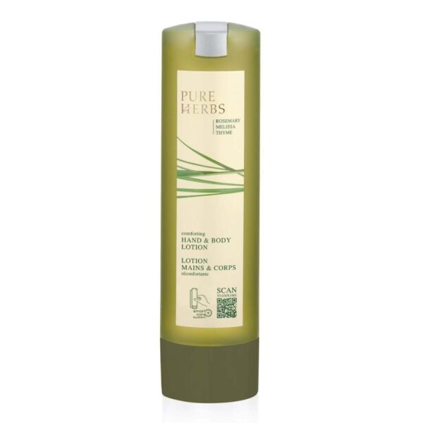 Loción manos y cuerpo 300ml para hoteles Pure Herbs, sostenible y calmante, con ingredientes naturales y un aroma revitalizante de romero, melisa y tomillo para una experiencia de bienestar única. Presentado en un envase de 300 ml con el innovador sistema Smart Care, es la opción sostenible para tu rutina diaria.