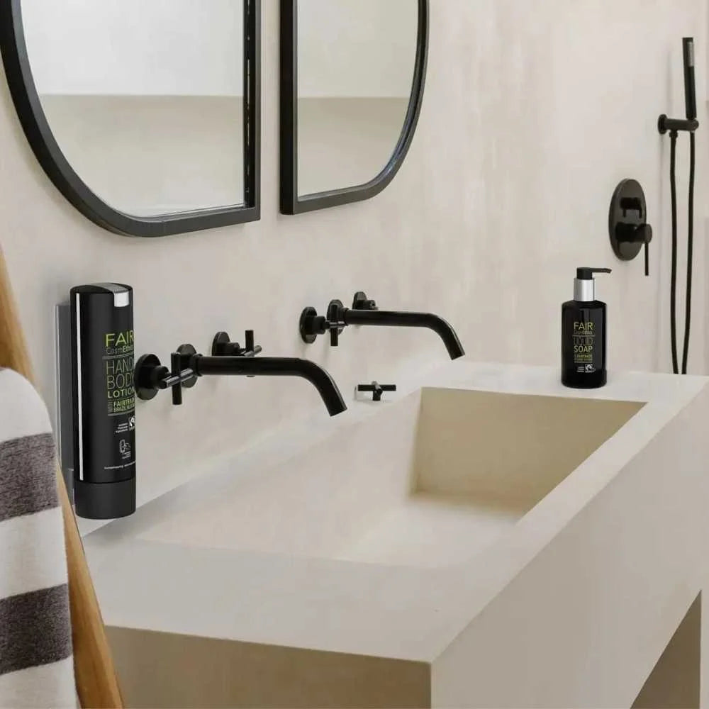 A Fair CosmEthics posiciona-se como uma coleção de produtos de higiene pessoal que abraça a sustentabilidade em todos os aspetos da sua criação. Desde as suas fórmulas à base de ingredientes vegetais, com certificação de comércio justo e isentas de parabenos e silicones, até ao design de embalagens recicláveis e à utilização de dispensadores com tampas higiénicas, cada escolha reflete o compromisso da marca com a responsabilidade ambiental.